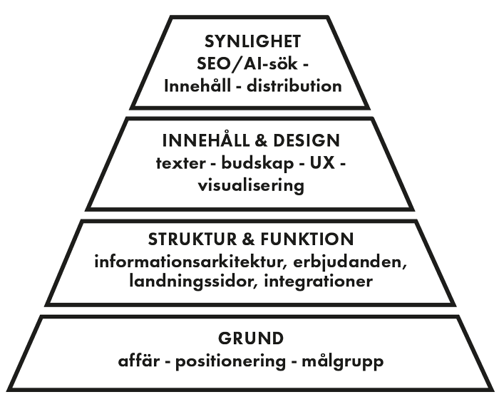 En effektiv webbplats hjälper besökaren att förstå sitt behov, se värdet i din lösning och ta nästa steg. Det handlar inte bara om att presentera information – utan om att strukturera den så att den blir lätt att ta till sig. För B2B-företag innebär det ofta att förklara mer komplexa erbjudanden, bygga förtroende och guida besökaren genom en längre beslutsprocess. Därför börjar en effektiv webbplats inte med design – utan med struktur, innehåll och en tydlig idé om hur besökaren rör sig genom webbplatsen.